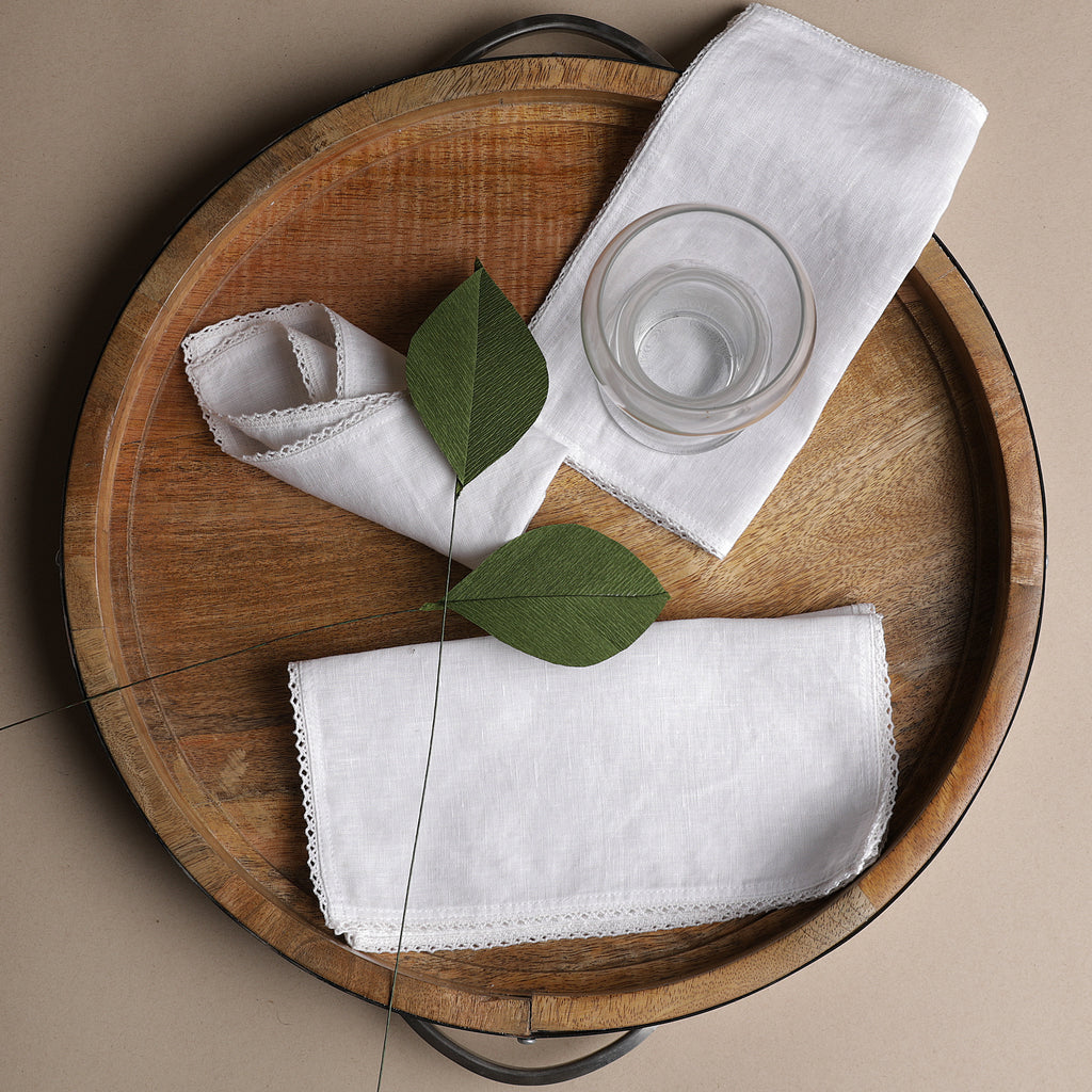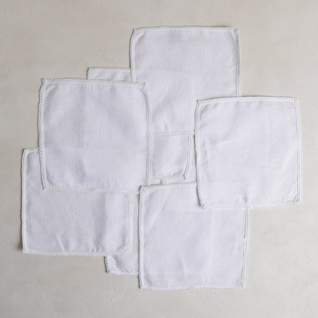 A set of 8 white cocktail napkins, delicately trimmed for an elegant evening. A neutral, no-fuss solution for casual as well as formal dining, the Linen Basics range of Table Napkins, made of 100% Cotton Linen, have a luxurious yet subtle and warm feel. Craft - Edged with classic English beading.