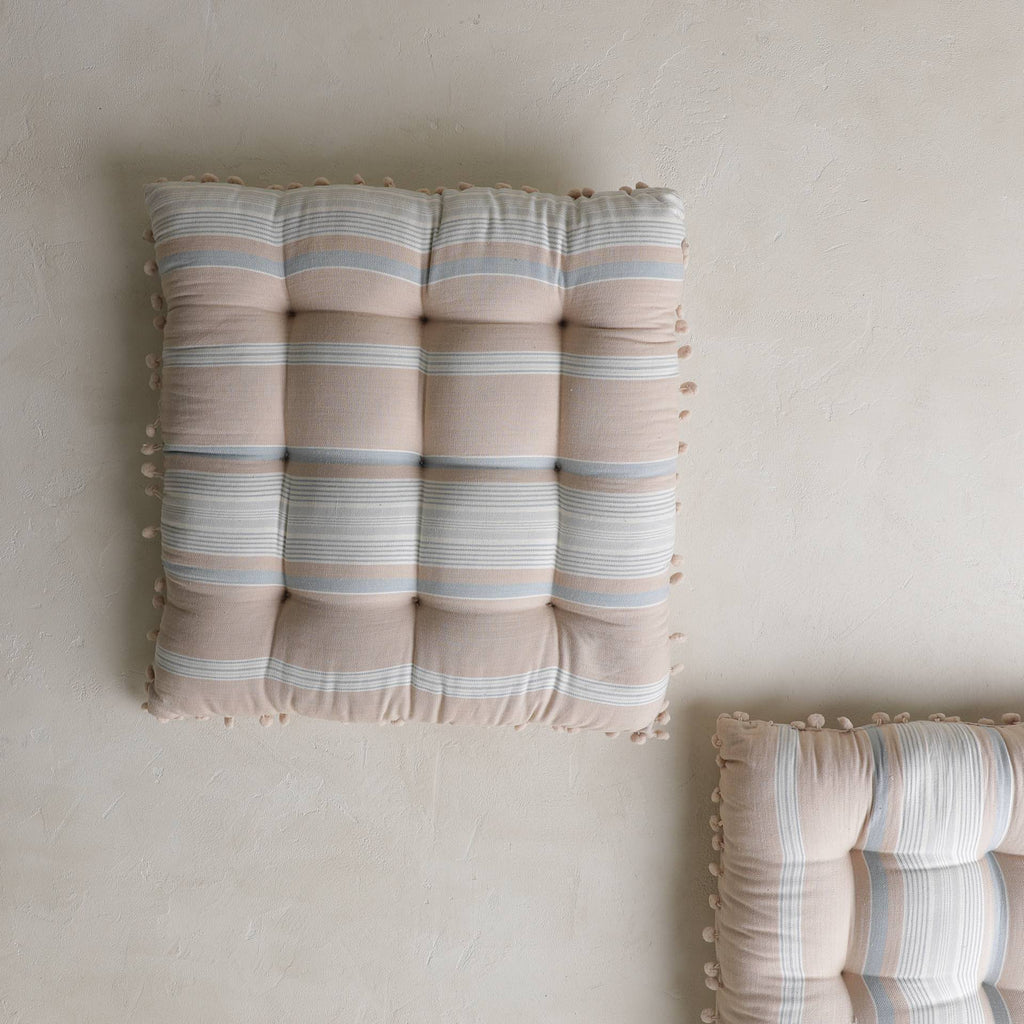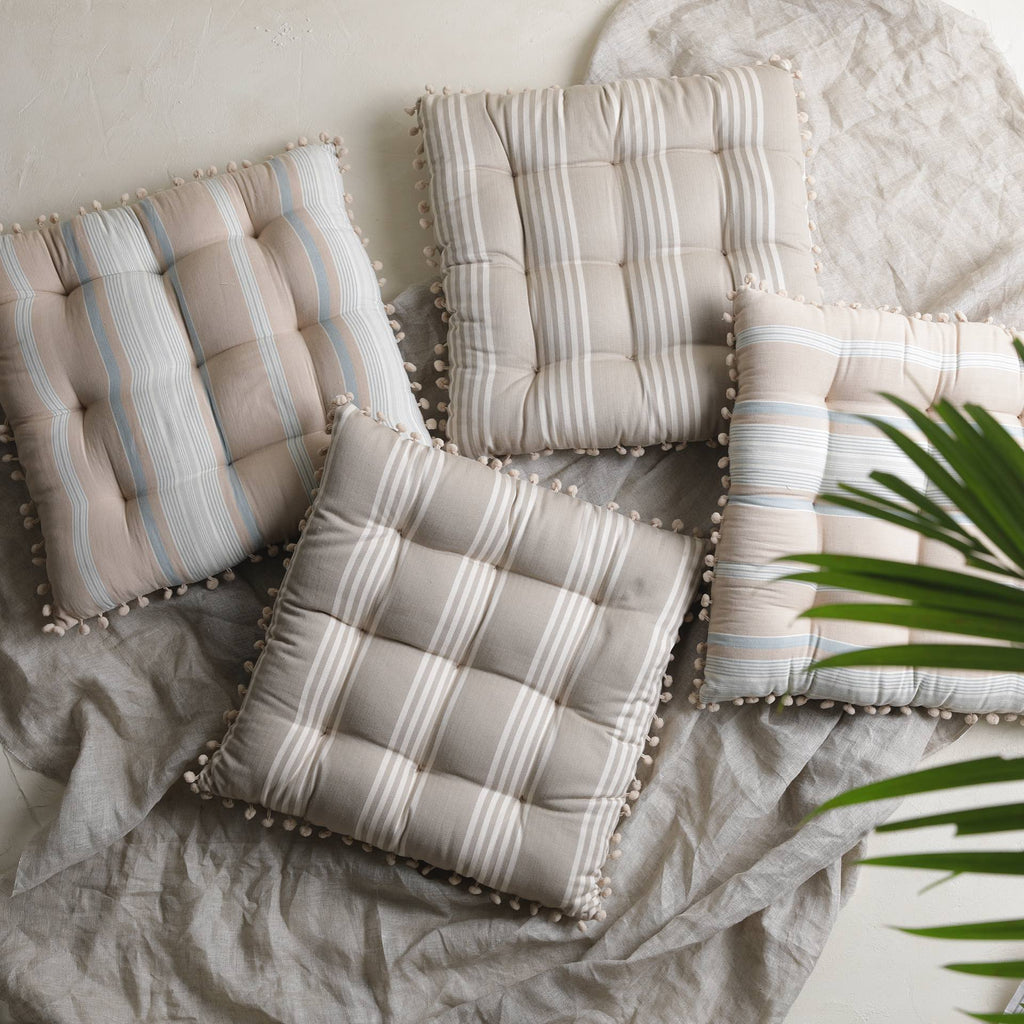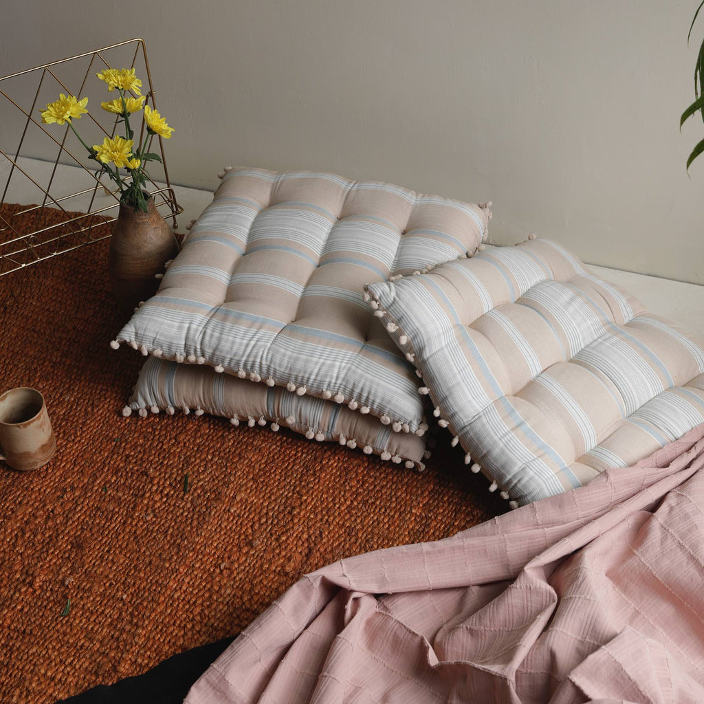 A set of 2 nomadic striped blue and white pin-tucked cushions with a delicately trimmed border. Ideal getaways for those lazy days. Filled with cotton. Craft - Laced with delicate pompoms.